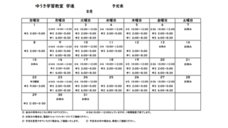 8月の予定8月の予定表(例)です。実際の月予定は、メニューの「お問い合わせ」より、当教室まで直接お問い合わせください。>>8月予定表8月の予定表はサンプルです。毎月の予定表は、緊急の場合を除いて公開しておりません。